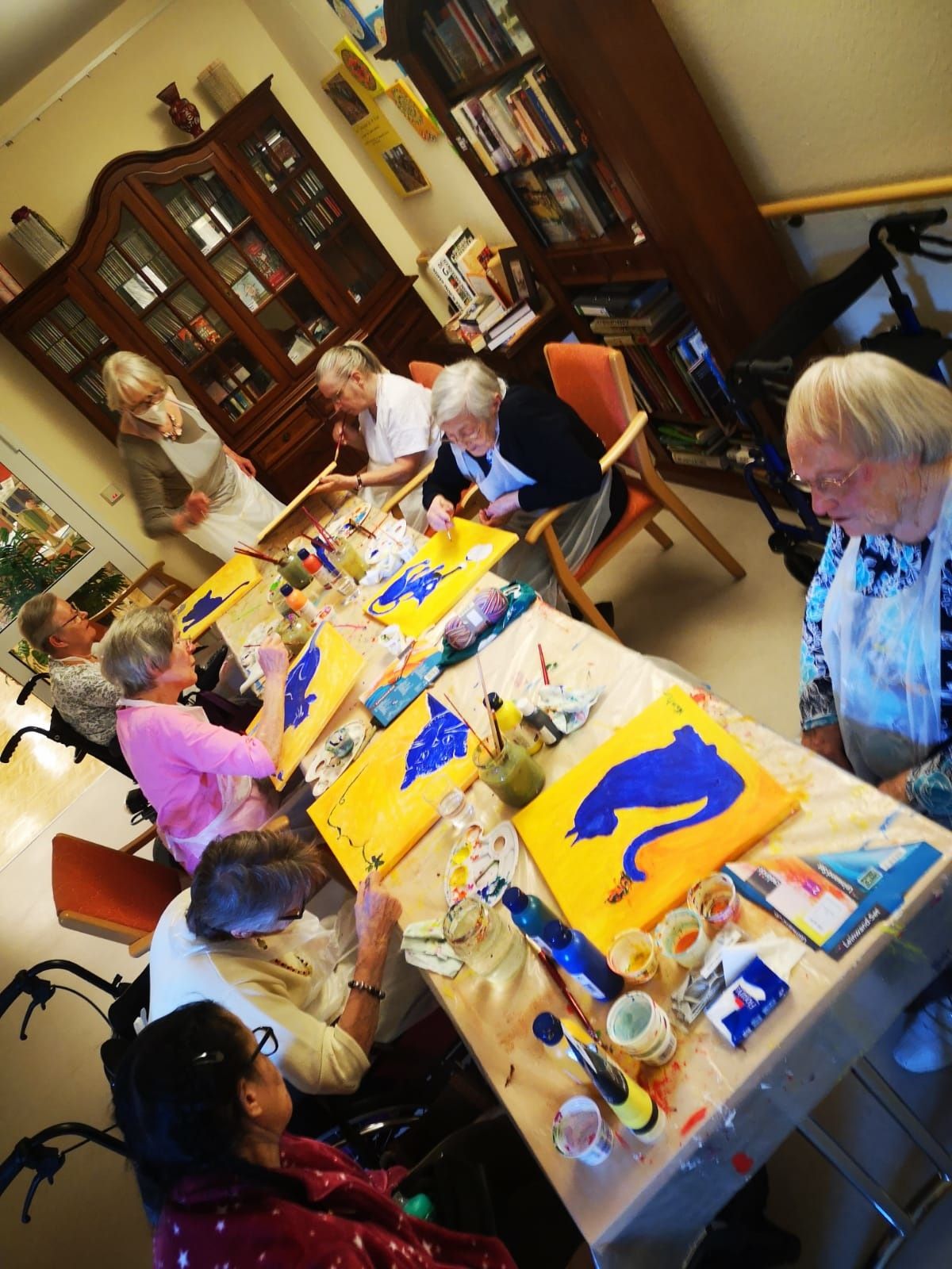 Seit 2016 gibt es das Angebot "Malkurs" für unsere Bewohner*innen in Zusammenarbeit mit einer Künstlerin und dem Sozialer Dienst. Das Entstehen eines Bildes wird Step by Step erklärt. Das fertige Bild lässt selbst unerfahrene Bewohner*innen erstaunen, was sie da erschaffen haben. Sie erhalten Anerkennung, Stolz und Feedback von der Gruppe, Mitarbeiter*innen und Angehörigen. Im laufe der Zeit hat sich das Angebot entwickelt, es entstehen Kunstwerke die in Ausstellungen ihren Platz gefunden haben und das nicht nur im Haus. Die Bewohner*innen würden ihre Bilder für andere AWO Häuser für Ausstellungen zur Verfügung stellen und an den Vernissagen teilnehmen wollen.